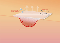 A 4.5 mm non-adhesive PU (polyurethane) foam dressing with one side covered with a thin PU film which provides a bacterial barrier.