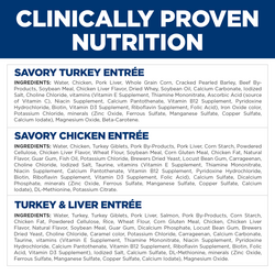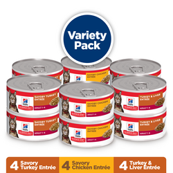 This variety pack contains 4 cans each of Turkey and Liver, Savory Chicken, and Savory Turkey Cat Foods. Your cat will love the taste of these delectable entrées and their soft, smooth texture. This product provides the purrfect balance between variety cats crave and the precise nutrition they need to maintain vital organ health.