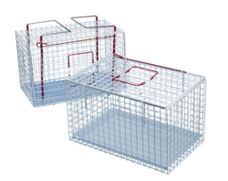 A white crate, plastic covered, with a double, adjustable wall. Dimensions are 54x30x30 cm.
