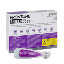 FRONTLINE® Shield for Dogs is an effective monthly topical product for treatment of fleas, ticks, and chewing lice, and repellency of mosquitos, ticks and stable flies. Effectively controls existing infestations and prevents reinfestations of fleas, ticks and chewing lice and aids in the control of Sarcoptes mite infestations. Convenient to use, easy to apply and lasts a full 30 days.