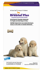 Drontal® Plus (praziquantel, pyrantel pamoate, febantel) dewormer is a broad spectrum tablet that treats tapeworm, roundworm, hookworm, and whipworm infections in dogs, and it can be safely used in puppies at least three weeks of age to get an early start on dewormer protocols.