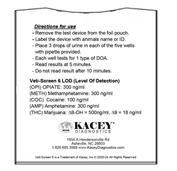 The Veti-Screen™ is a veterinary drug screen that can detect the presence of five common drugs of abuse in a pet's urine: cocaine, methamphetamine, amphetamine, THC delta-8, THC delta-9, and opiates. It is a rapid test that uses monoclonal antibodies to detect elevated levels of drugs in urine without the need for an instrument.